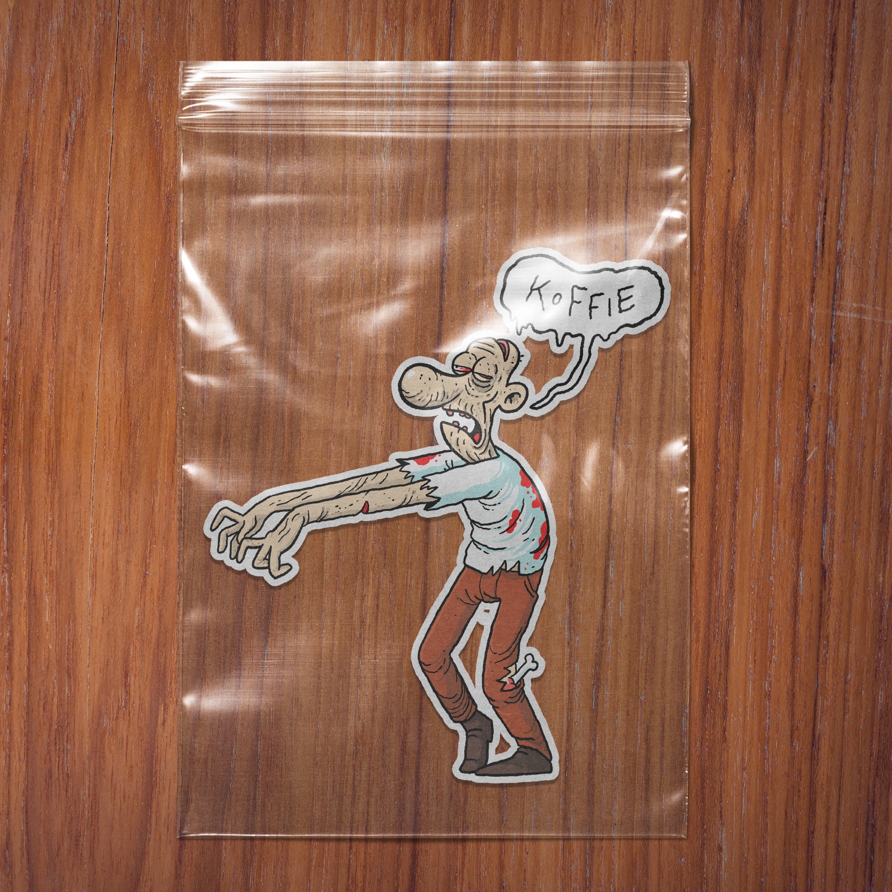 's Ochtends halfdood achter uw computer zitten kan vanaf nu in stijl! Deze sticker dient zich perfect voor uw laptop, koffiezet of voorhoofd. Want zo sloom zijt ge 's morgens dat ge dat niet eens zou door hebben.